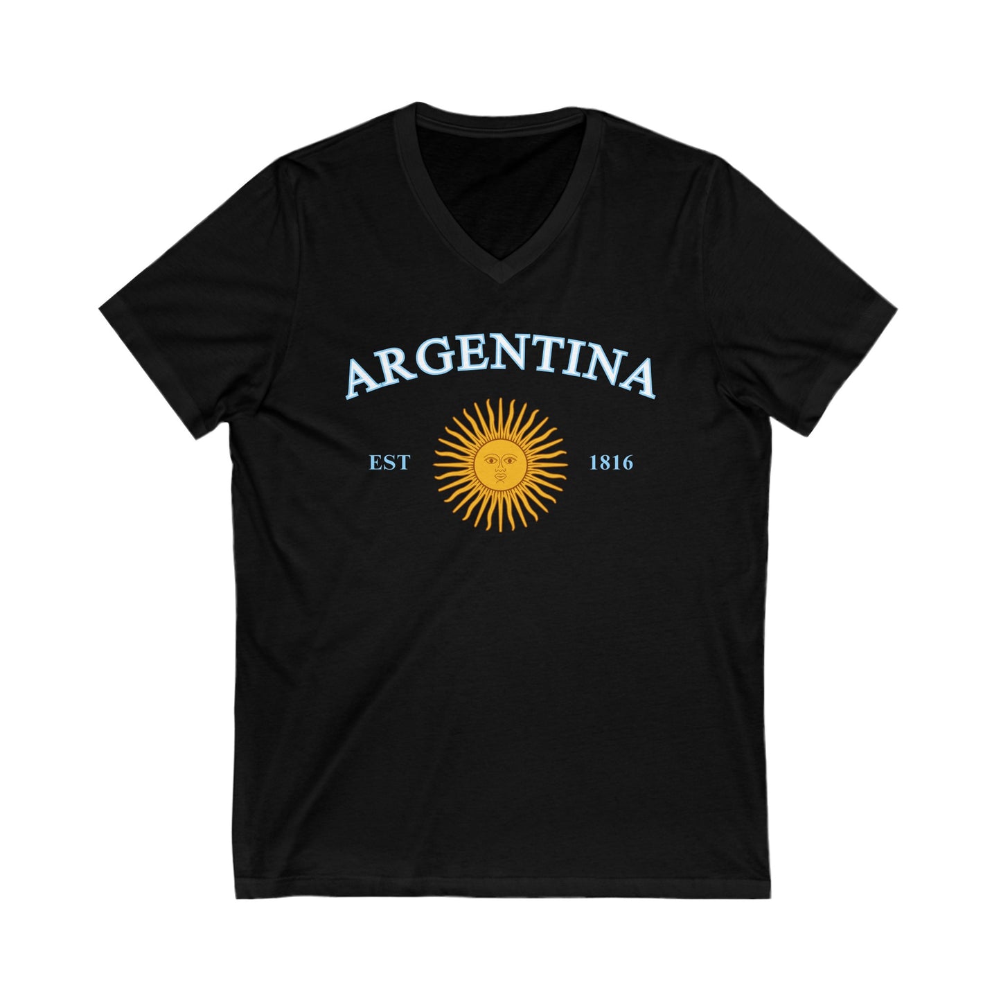 Luce con estilo y orgullo tu amor por Argentina con nuestra elegante remera cuello en V "Argentina EST 1816". Con el icónico sol de la bandera argentina y la fecha de nuestra independencia, esta prenda es perfecta para quienes desean llevar el espíritu de nuestra patria a cada rincón. El cuello en V le da un toque moderno y refinado, sin perder el sentido de tradición.